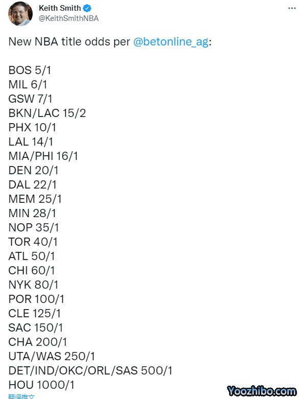 太阳1赔10排名第五,湖人1赔14排名第六。