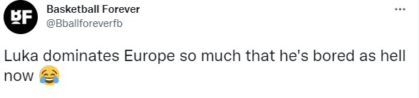 美媒Overtime晒东契奇扔水瓶一幕,配文写道:当我无聊的时候,我也会这样做;Basketball Forever则发推写道:东契奇对欧洲的统治力如此之大,以致于他现在无聊的要命;美媒还都配上一个笑哭的表情。