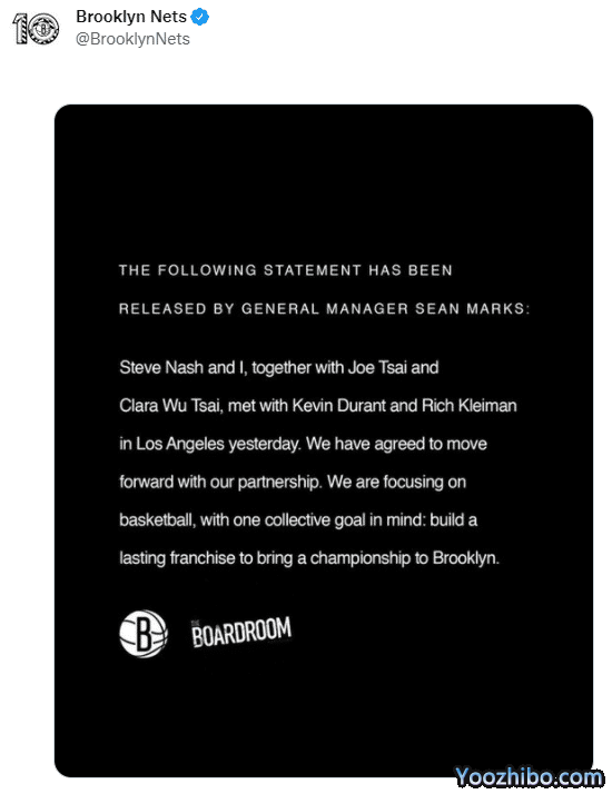 ESPN名记沃纳罗斯基表示,篮网表示,关于杜兰特的交易谈判已经结束,他的合同还剩4年1.98亿美元;对于杜兰特留队,名嘴夏普直言杜兰特带领篮网夺得一冠比他在勇士夺得两冠更有意义。