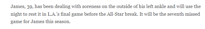 昨天湖人轻松击败活塞赛后,詹姆斯表示他不会出战与爵士的比赛,对于詹姆斯轮休,湖人随队记者DaveMcMenamin跟进报道,詹姆斯一直经历左脚踝外侧的酸痛感,他将在湖人全明星假期前的最后一场比赛中休养脚踝。这将是詹姆斯本赛季缺席的第7场比赛。