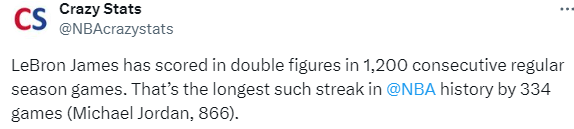 据外媒Crazy Stats统计,詹姆斯已经达成连续1200场常规赛得分上双的历史第一成就,排名第二的是乔丹(866场)。