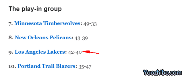 ESPN看好排名在湖人前面的8支球队(括号内是预测胜场)依次是太阳(56胜)、勇士(55胜)、掘金(53胜)、灰熊(51胜)、快船(50胜)、独行侠(49胜)、森林狼(49胜)和鹈鹕(43胜)。在ESPN看来,森林狼、鹈鹕、湖人和开拓者是新赛季最有可能进入附加赛范围的4支球队。