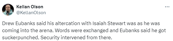 据太阳记者Kellan Olson报道,尤班克斯表示他刚刚到达球馆,当时他还穿着便装,在进入更衣室前和斯图尔特发生争执,双方争吵,尤班克斯证实他被打了一拳,安保人员第一时间介入。