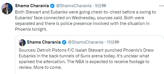 来源:JRS直播网02-15 19:34JRS直播网02月15日讯 ,太阳对阵活塞赛前,NBA突发意外事件,据名记Shams报道,活塞悍将斯图尔特在球员通道中殴打太阳球员尤班克斯,NBA将进行录像分析审查,两人撞胸当面对峙,斯图尔特一拳打到尤班克斯脸上,菲尼克斯当地的警察介入!