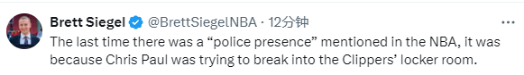 据NBA记者Brett Siegel报道,NBA上一次冲突时有警方来到现场还是2018年1月,保罗带着火箭众人要冲进快船更衣室要说法——当时,部分火箭队友对小里弗斯和格里芬比赛中的一些举动感到不满,赛后要冲进快船更衣室找他们当面对峙,曾效力快船、当时效力火箭的保罗“老马识途”,指出一条暗道,由阿里扎带着众人(保罗、哈登、杰拉德-格林)冲锋。