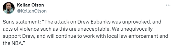 太阳官方发布声明:(斯图尔特)无缘无故袭击尤班克斯,此类暴力行为是不可接受的。我们明确支持尤班克斯,并将继续与当地执法部门和NBA合作。