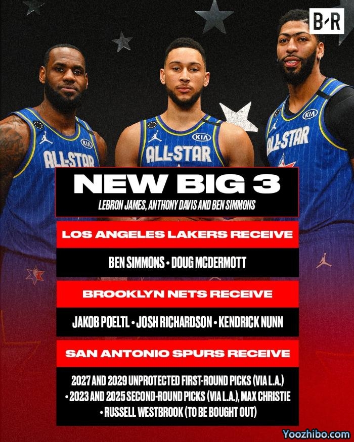 湖人、马刺和篮网三队的具体交易方案:湖人得到本-西蒙斯和麦克德莫特;篮网得到铂尔特尔、约什-理查德森和纳恩;马刺得到2027年和2029年无保护首轮选秀权(来自湖人队),2023年和2025年次轮选秀权(来自湖人队),马克斯-克里斯蒂和威少。