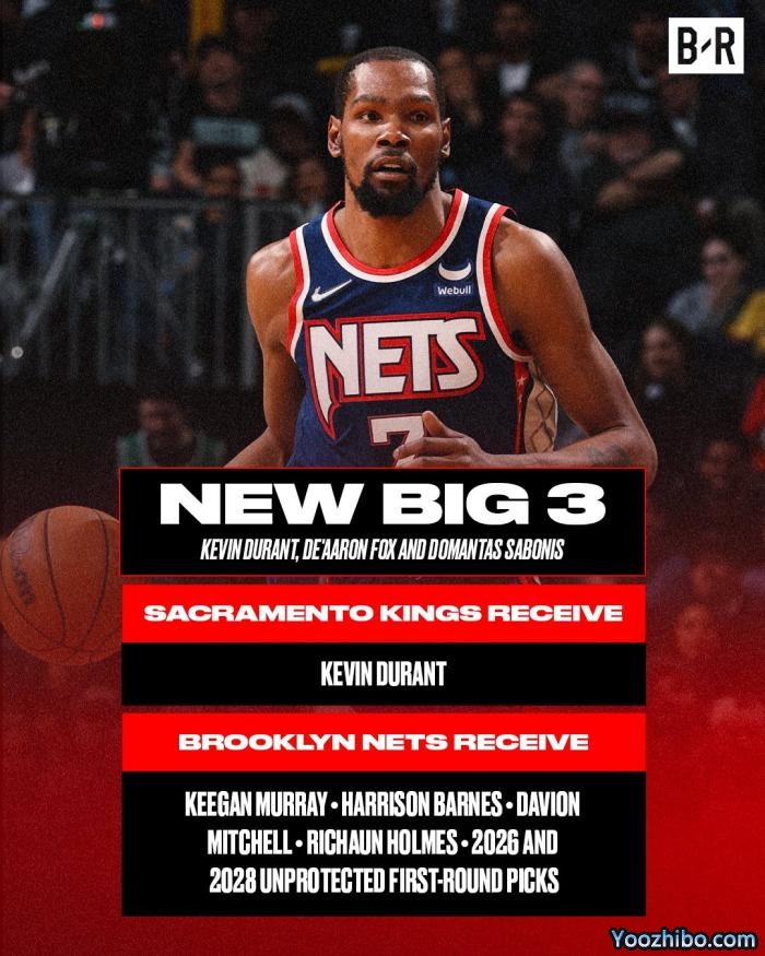 具体交易方案:篮网把杜兰特交易到国王,得到基根-穆雷、哈里森-巴恩斯、戴维翁-米切尔、霍姆斯、2026年和2028年不受保护首轮签;如此交易的话,杜兰特将联手福克斯和萨博尼斯带队冲击季后赛。