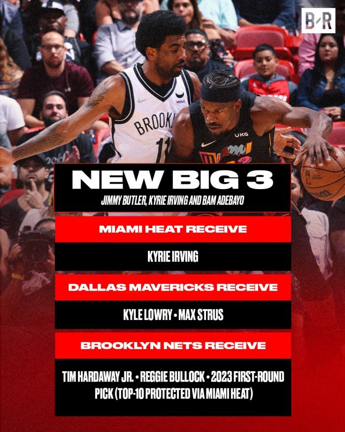 热火、独行侠和篮网三方交易具体方案:热火得到欧文,可组成巴特勒、欧文和阿德巴约的三巨头组合;独行侠得到洛瑞和斯特鲁斯;篮网得到小哈达威、布洛克、2023年前十保护首轮签(来自热火)。
