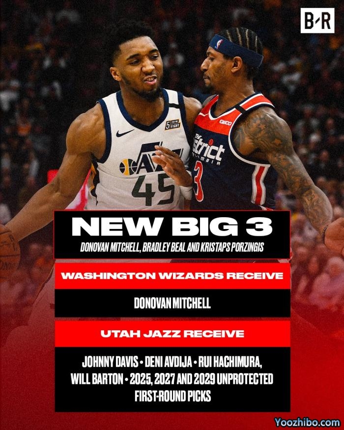 具体的交易方案:爵士把米切尔交易到奇才,得到约翰尼-戴维斯、阿夫迪亚、八村塁、威尔-巴顿、2025年、2027年和2029年不受保护首轮签。