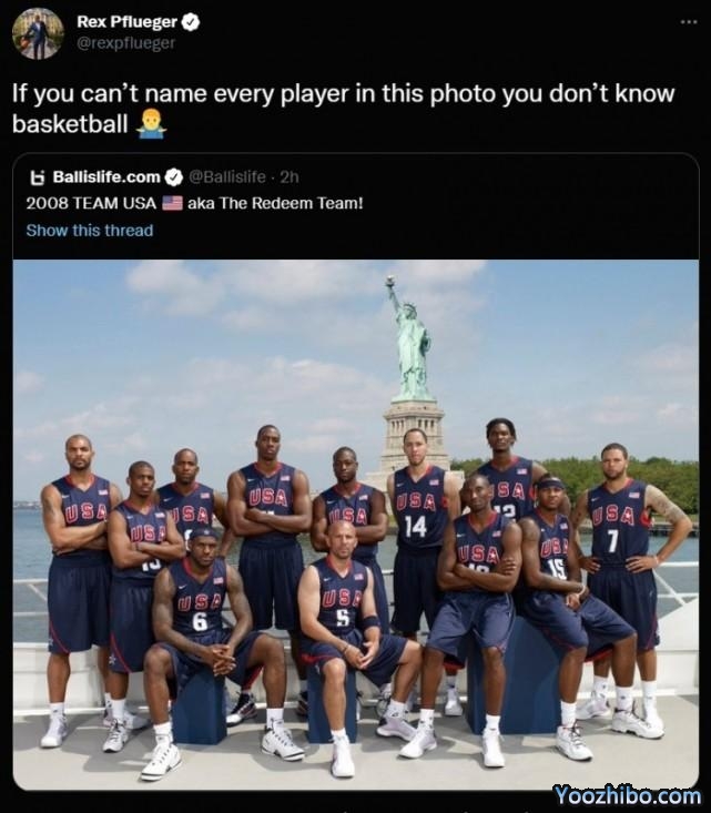 美媒Ballislife晒出了一张美国2008年奥运男篮的合照。媒体人Rex Pflueger转发配文道:“如果你说不出照片里每一个人的名字的话,那你就不了解篮球。”