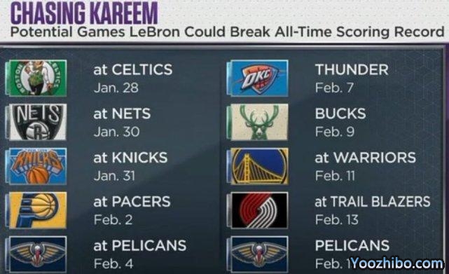 詹姆斯(37062分)目前距离贾巴尔(38387分)还差1325分,美媒推测他将在1月29日至2月16日的比赛区间内超越贾巴尔,登顶历史得分王。这10场比赛的对手依次是绿军、篮网、尼克斯、步行者、鹈鹕、雷霆、雄鹿、勇士、开拓者和鹈鹕。