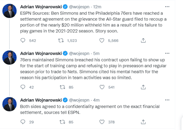 消息人士透露,双方已经同意就确切的财务结算签署保密协议。名嘴斯蒂芬-A-史密斯在节目上透露,自己近期碰到过西蒙斯。两人交流很愉快。“我对他不打比赛有意见,但那已经过去了,他现在已经准备好为篮网打球,他发誓他准备好了,我支持我的兄弟。”
