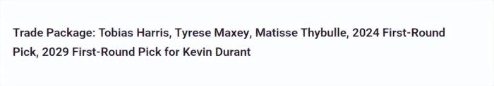 JRS直播网08月16日讯 杜兰特辟谣退役传闻,KD的闹剧仍在继续。北京时间8月16日,美媒Fadeaway World晒出了一笔关于杜兰特的新交易方案,具体内容是篮网送出杜兰特,得到76人的托比亚斯-哈里斯、马克西、塞布尔、2024年首轮签和2029年首轮签。(注:此前有报道称,76人唯一能交易的首轮是2029年首轮,若满足这笔方案,76人还得先通过交易得到一个首轮)