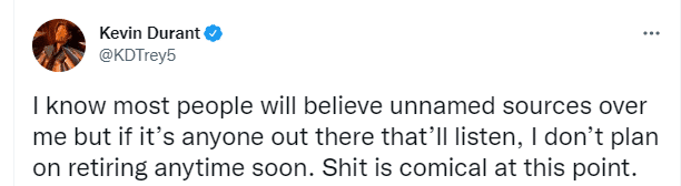 杜兰特发推写道:我知道大多数人会相信匿名消息来源胜过我,但如果有人愿意听,我短期内不打算退役。这狗屁流言真是太可笑了。