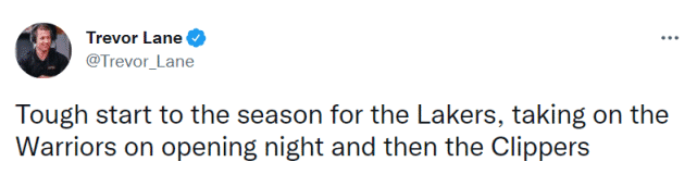 湖人记者Trevor Lane表示,对于湖人来说,新赛季的开局就是很大的挑战。他们将在首场比赛对阵上赛季冠军勇士,随后又碰到老冤家快船。