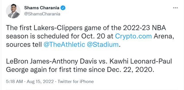 来源:JRS直播网08-15 15:44JRS直播网08月15日讯 ,名记Shams报道称,多位消息人士透露,2022-23赛季常规赛湖人与快船的首次交手将在10月21日(北京时间,下同)进行。这将会是自2020年12月23日以来,詹姆斯+戴维斯的组合首次对阵莱昂纳德+乔治的组合。时隔667天,湖人和快船的双核将一决高下!