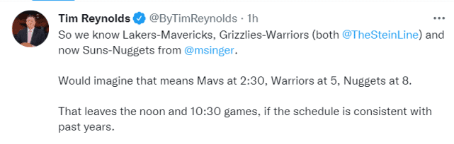 NBA名记Tim Reynolds推测,湖人对独行侠的比赛时间将被安排在2点30分(北京时间,下同),勇士对灰熊的比赛是5点,掘金对太阳的比赛是8点。若赛程的具体时间和去年一样,现在还差0点的比赛和10点30分的比赛还没公布。