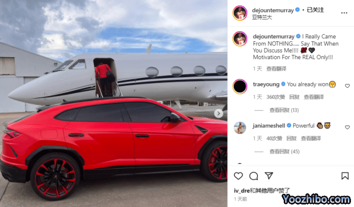 穆雷在Ins上晒照,晒出自己开豪车兰博基尼,然后搭乘私人飞机的照片;并且配文写道:我真的从一无所有起步。讨论我前先看看这些吧!动力是真实的。老鹰球星特雷-杨在评论区留言:你已经是赢家了。