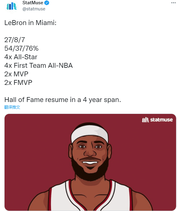 美媒Stat Muse晒詹姆斯热火四年生涯荣誉:出战294场常规赛,场均27分8篮板7助攻,投篮命中率54%、三分命中率37%和罚球命中率76%;4次入选全明星、4次最佳一阵、2次常规赛MVP、2次总冠军和2次总决赛MVP;美媒直言:詹姆斯4年打出名人堂级别的表现。