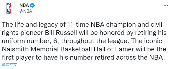 对于联盟官宣退役拉塞尔的6号球衣,NBA总裁萧华表示:比尔-拉塞尔在球场上取得了无与伦比的成功,他开创了民权运动的先河,他值得以一种独特的、具有历史意义的方式受到表彰。在每一支球队中退役拉塞尔的6号球衣,是为了确保拉塞尔卓越的职业生涯能被永久得到认可。