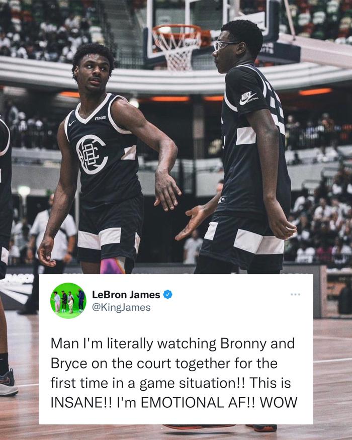 今天詹姆斯的两个儿子17岁布朗尼和15岁布莱斯首次联手出战,詹姆斯激动发推写道:兄弟们,我真的是第一次在比赛中看到布朗尼和布莱斯一起在场上!!这太疯狂了!!我真的很激动!!哇哦。