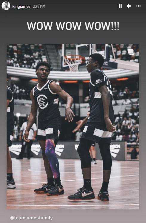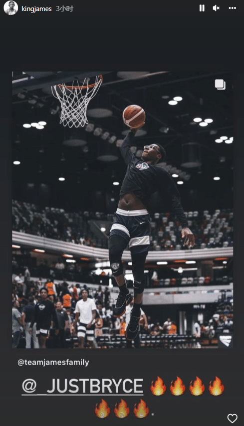 詹姆斯还晒出布朗尼和布莱斯同框合影,直呼哇呜;晒布莱斯扣篮照,配上7个火的表情。