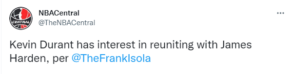 来源:JRS直播网08-11 09:58JRS直播网08月11日讯 ,过去一夜NBA又有哪些市场动态?杜兰特最新理想下家是76人和凯尔特人,KD想要与哈登重聚;美媒列76人6换1交易方案,塞克斯顿与骑士存在巨大分歧并且续约谈僵,勇士、火箭等队公布季前赛赛程。