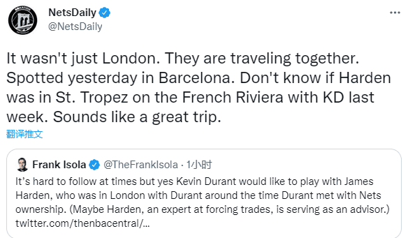 今年休赛期,杜兰特和哈登一起现身伦敦,参加好友Travis Scott的演唱会,他们在现场跳舞嗨翻天,据报道,除了在伦敦相聚,他们还一起旅行,近日他们还被拍到共同现身巴塞罗那。