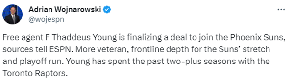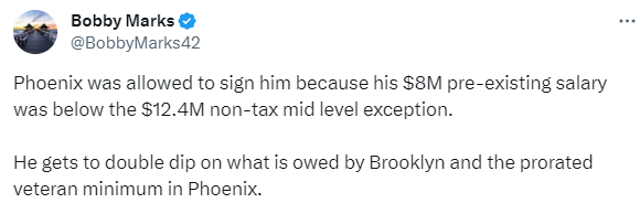 薪金专家Bobby Marks跟进报道,由于赛迪斯-杨被裁掉前的年薪为800万美元,低于全额中产特例1240万美元,太阳可以直接签下他,他可以从太阳和篮网两队领取薪水。