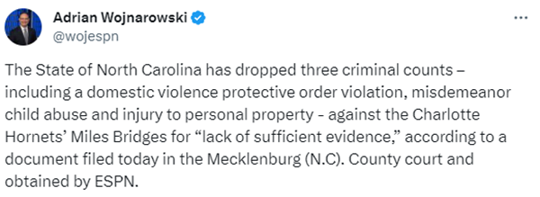 据名记woj报道,北卡罗来纳州梅克伦堡县法院以“证据不足”为由撤销了对布里奇斯的三项指控,分别为违反家庭暴力保护令、虐待儿童(轻罪)和损害个人财产。