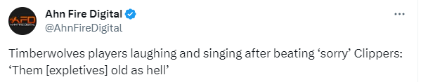 Justin Russo报道称,在森林狼客场击败快船赛后,三名森林狼球员和其他几名球队工作人员在球员通道中大声唱歌,人群中传来阵阵笑声,有球员爆粗大喊:他们(快船球员)太TM差劲了!太TM老了。