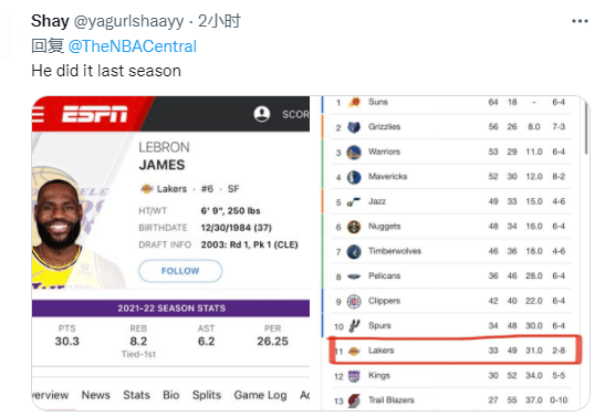 21-22赛季,37岁詹姆斯的个人表现十分出色,不过由于湖人战绩糟糕,勒布朗经常被质疑刷数据;新赛季,詹姆斯将会冲击历史得分王宝座,不过湖人队的冲冠实力令人担忧,在NBA官方最新西部球队战力榜上,湖人仅仅排名第九。
