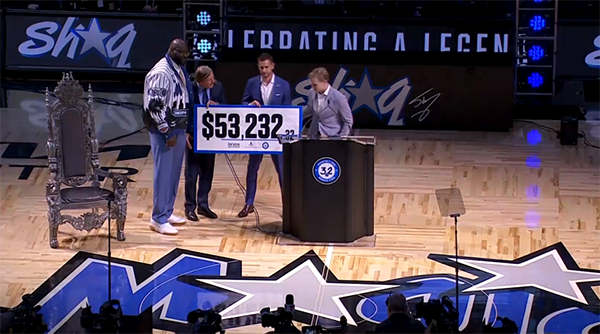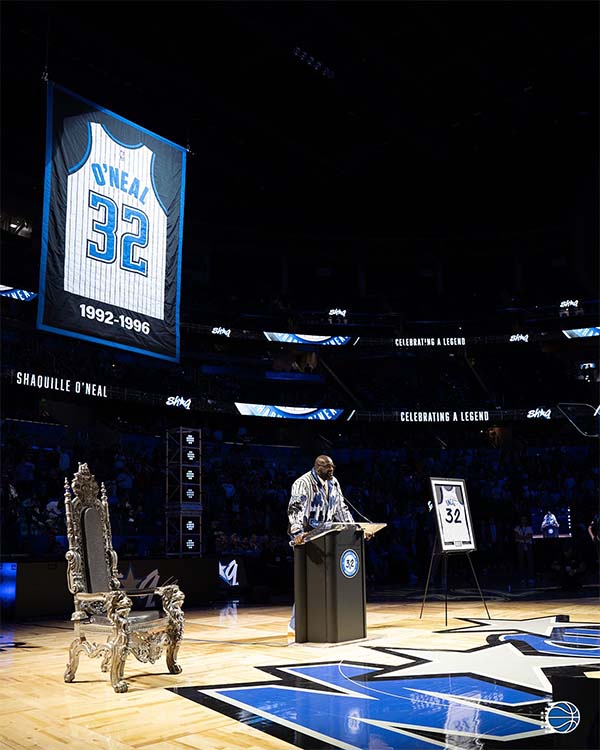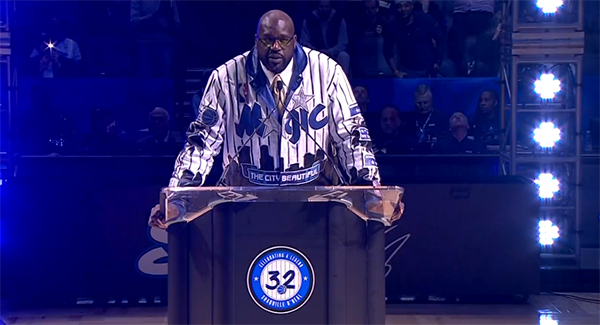 “便士”哈达威等人演讲发言期间,奥尼尔换上特制的魔术队夹克;一番演讲后,奥尼尔的魔术队32号球衣正式揭幕,奥尼尔发言,感谢并夸赞哈达威等前队友以及喊上众前队友;恭喜奥尼尔成为魔术队史第一人退役球衣的球员。