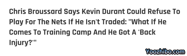 “要是他来到训练营后,就出现‘背部伤病’会怎么样?这就是我所说的。他会不会把情况搞得更难堪?哈登、西蒙斯、戴维斯都曾经有过这种情况,让你不得不交易他们。我不知道杜兰特会不会这么做。大部分人,包括我在内,应该都觉得他不会。”