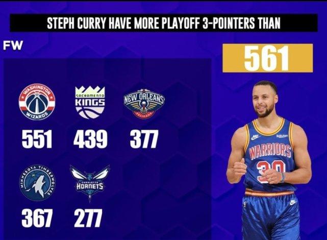 1、库里已经在季后赛命中561记三分,比奇才(551记三分)、国王(439记三分)、鹈鹕(377记三分)、森林狼(367记三分)和黄蜂(277记三分)各队队史季后赛三分命中数还多;库里也是该纪录NBA历史第一保持者,比第二名的汤普森(451记三分)多进110记三分。