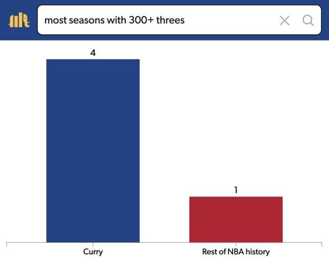 3、库里4次单赛季至少命中300记三分,史上其他球员加起来仅1次(哈登378记三分);库里单赛季402记三分历史唯一。