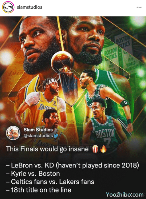 来源:JRS直播网08-07 20:54JRS直播网08月07日讯 如果让你预测NBA明年的总决赛,你觉得会是怎么样的?北京时间8月7日,美媒slamstudios在ins上晒出了他们的终极幻想,詹姆斯、浓眉哥、欧文领衔的湖人对决杜兰特、塔图姆、布罗格登带领的凯尔特人。