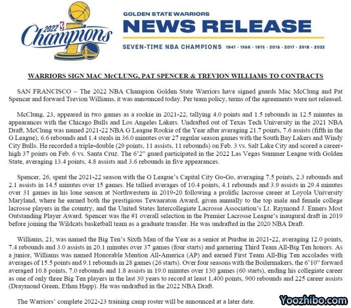 勇士官宣连续签下三名球员,与麦克-朗签下1年无保障合同;与斯潘塞签下无保障的训练营合同以及与落选秀特雷维恩-威廉姆斯签下一份Exhibit10合同。