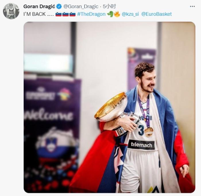 14、公牛球员德拉季奇晒出自己身披斯洛文尼亚国家队球衣照片,自己宣布将出战欧锦赛,配文写道:“我回来了!