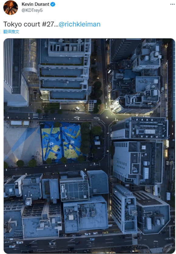 另外值得一提的是,杜兰特发推宣布又翻新一个篮球场,改造位于东京大久保公园球场,球场中央的logo是KD的标志;这是杜兰特基金会在全球翻新的第27座球场,致力于打造更迷人、更艺术的球场。