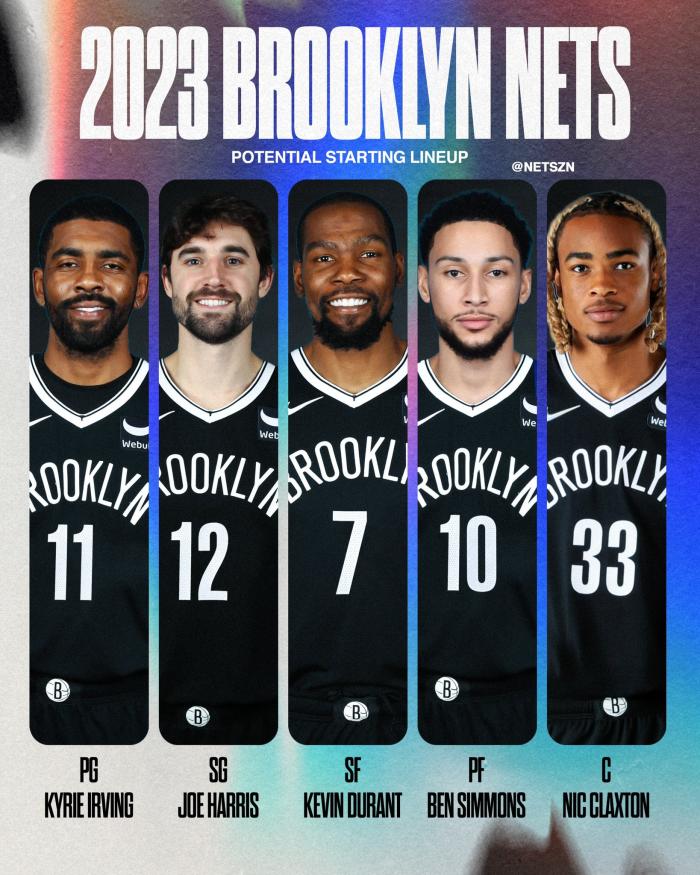 目前篮网队14人名单是杜兰特、欧文、西蒙斯、赛斯-库里、克拉克斯顿、乔-哈里斯、米尔斯、TJ-沃伦、罗伊斯-奥尼尔、托马斯、夏普、爱德华兹、埃德蒙-萨姆纳和A-威廉姆斯(双向合同球员);美媒预测篮网新赛季首发五虎是杜兰特欧文、乔-哈里斯、西蒙斯和克拉克斯顿。
