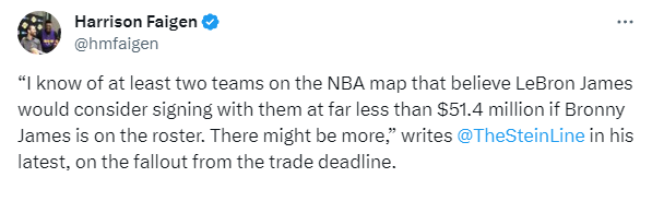 Stein报道,据了解,联盟中有至少两支球队相信,如果选中布朗尼让他进入球队,詹姆斯会考虑以远低于5140万美元的价格加盟。这样的球队还会有更多。