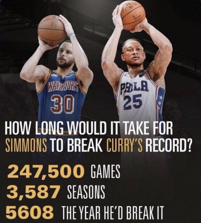 告别赛场很久的西蒙斯,能在新赛季恢复几成功力还不得而知。不过,已经有球迷晒出一张图来调侃他的三分能力了。图上显示,西蒙斯需要用247500场比赛,3587个赛季,直到5608年才能打破库里的三分纪录。