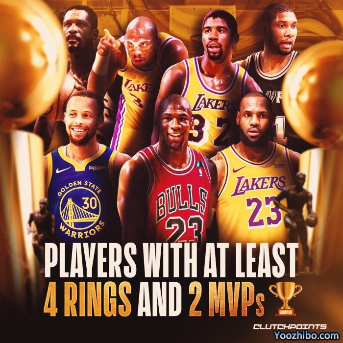 詹姆斯已经在NBA打了19个赛季,四次带队夺冠并且四次夺得FMVP以及四座常规赛MVP;据美媒CLutch Points统计,NBA史上仅有7名球员至少2次夺得常规赛MVP且4次夺冠,他们分别是詹姆斯、库里、乔丹、贾巴尔、比尔-拉塞尔、邓肯和约翰逊,其中拉塞尔已经去世,享年88岁,生涯11次夺冠且5次夺得常规赛MVP。