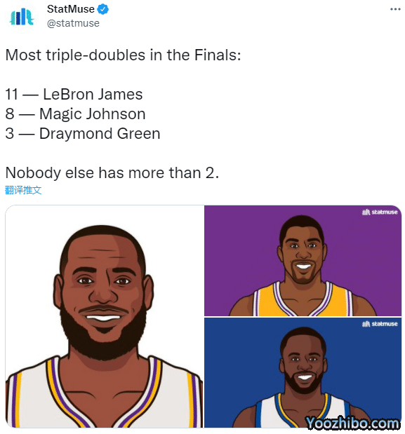 美媒Stat Muse晒出詹姆斯的另一纪录,老詹总决赛11次三双历史第一,魔术师8次历史第二,勇士格林3次历史第三,除了他们三人之外,史上无人在总决赛至少拿到2次三双。
