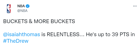小托马斯身穿10号球衣重返德鲁联赛,第一节就展现不俗的得分能力,里突外投单节轰下14分,NBA官方转发小托马斯命中三分的画面,并且配文写道:他在首节就火力全开。