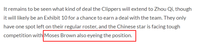clutchpoints在报道中指出,快船目前的常规阵容还有一个名额,另外还有一个双向合同名额。如果周琦能加入快船的训练营,先签一个Exhibit 10的合同,就能有机会去竞争留队名额。clutchpoints还提到,22岁中锋摩西-布朗也盯着快船的名额,他身高2米18,有可能成为周琦潜在的竞争对手。