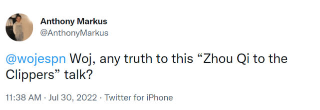 最近几天,不少球迷在推特上询问周琦是否有望回归NBA,还有球迷艾特了像Woj这样的名记,希望得到更准确的消息,但没有收到答复。