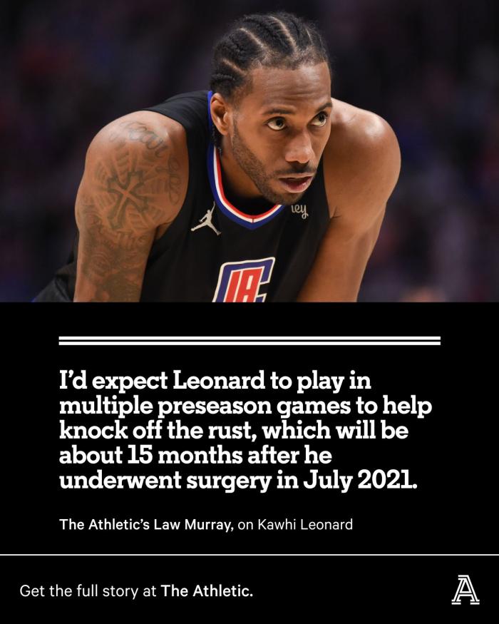据美记者Law Murry报道,据开怀-莱昂纳德身边的人士透露,莱昂纳德已经为新赛季做好了身体准备,他不会因为前交叉韧带手术的恢复而带来任何精神上的焦虑;预计莱昂纳德将会打多场季前赛,帮助他找回状态,毕竟他已经连续缺席数月的比赛。